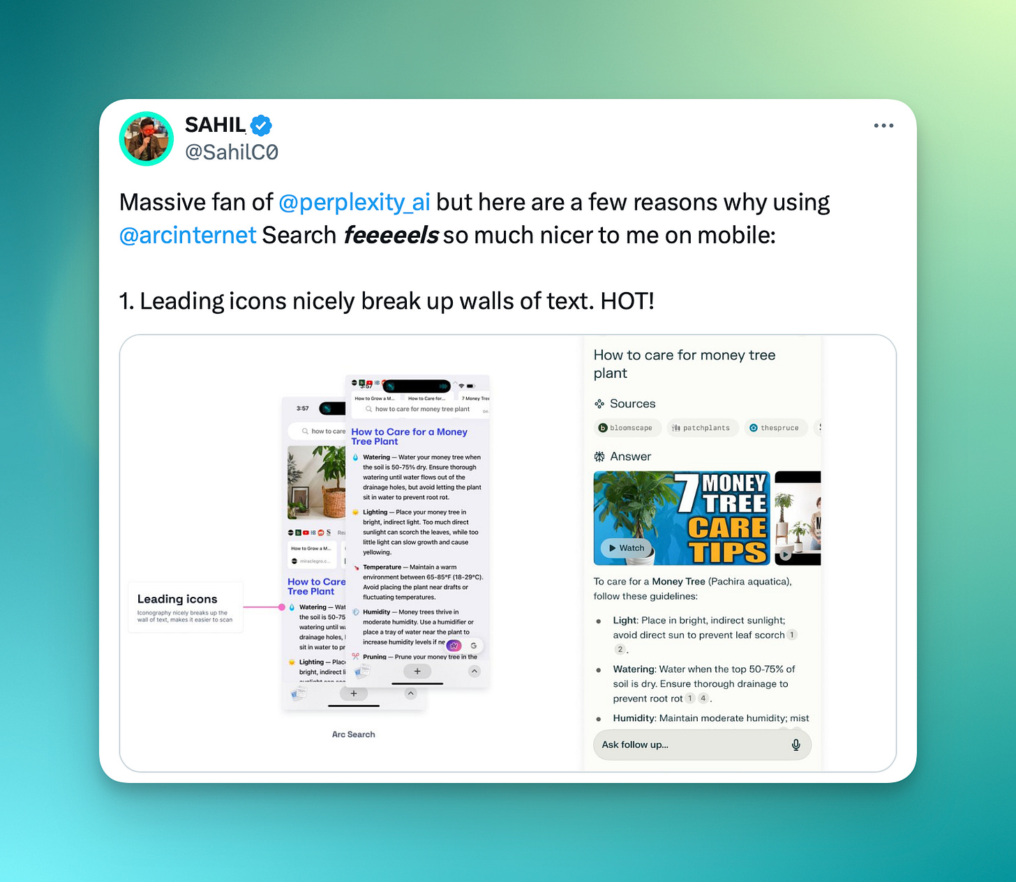 I’ve been using both Perplexity and Arc Search, two AI search engines, for a while. While I’m a big fan of both, I’ve always noticed that using Arc Search always felt much easier to scan and digest information. So I wanted to do a quick analysis of why. Take a look at my Twitter thread below, but I think there are some quick wins Perplexity can pull out to make for a much more pleasurable search experience! What do you think?