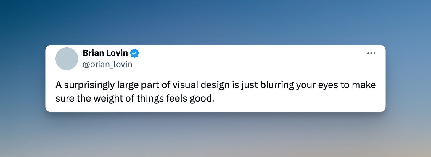 A quick way to check the visual hierarchy of your screen is to give it a quick squint test. I do this all the time. Sometimes I’ll even add a literal blur frame on top of a screen to see if I can quickly understand what my primary action is, and parse the flow of the page.