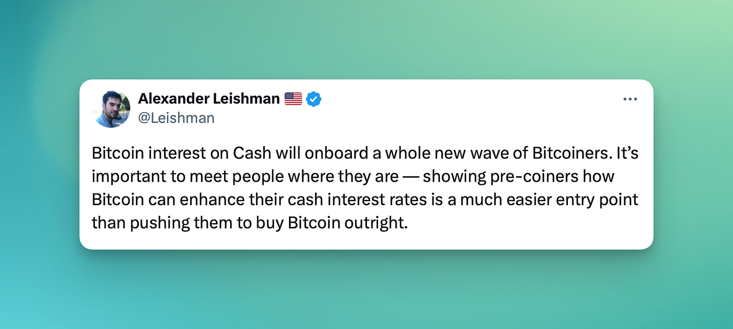 While maybe not directly related, I loved the framing of the new announcement of the Bitcoin Interest on Cash feature. Power users might find this unnecessary (get higher interest in your fav neobank like Wealthfront, then buy bitcoin), but this product skips a step and meets most people where they are. A great point that someone at Austin Bitcoin Design Club also pointed out: this product is a great foot in the door to eventually buying larger sums of bitcoin. Nice!