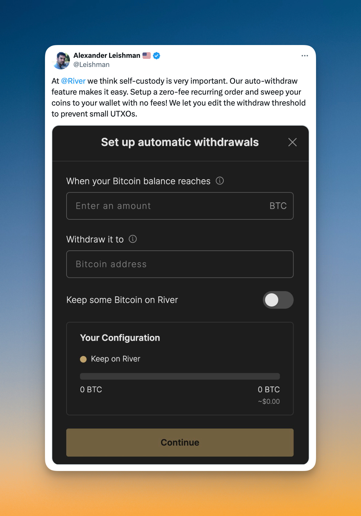 I love how these labels on River’s auto-withdrawal feature are so dead simple to understand. They could have very easily gone with more rigid, wordy, cold language like “Amount of bitcoin to keep in custody” or something. Instead, the label is self explanatory, scannable, and easily understandable: yeah, I DO want to “keep some bitcoin on River”!