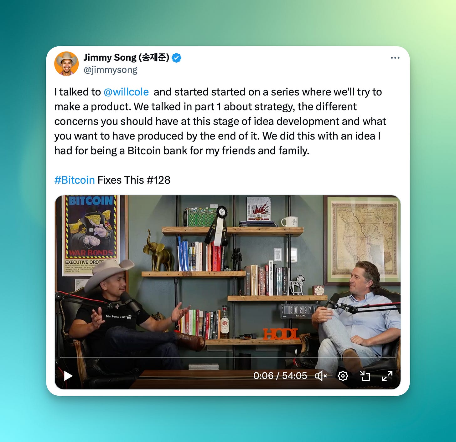 Quick shoutout to friend (and former manager at Unchained!) Will Cole, now at Zaprite, who recently went on Jimmy Song’s podcast to kick off a multi part series on the product development process. Lots of golden nuggets in here, don’t miss it.