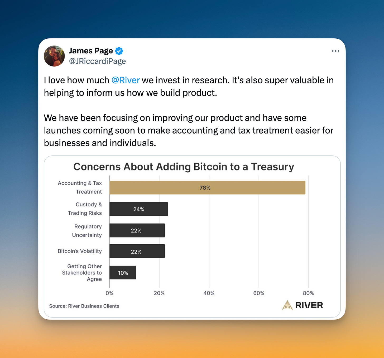 I appreciate the effort River put into learning more about what their business clients actually need instead of speculating (and then losing a bunch of time building it). With this data, clearly the biggest concern is accounting and tax treatment, which they can now tackle head-on.