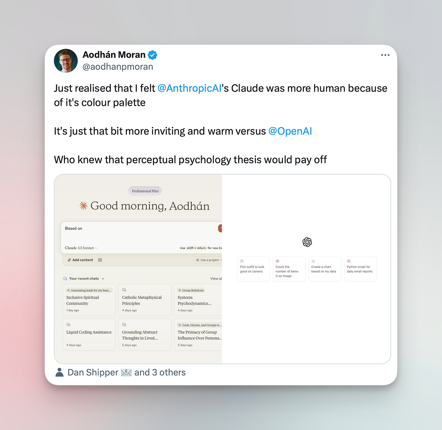 Related: Aodhan identifies the difference in feeling between Claude and ChatGPT. Claude’s type, color palette, and less rigid logo make for a much more humane feel — I agree!