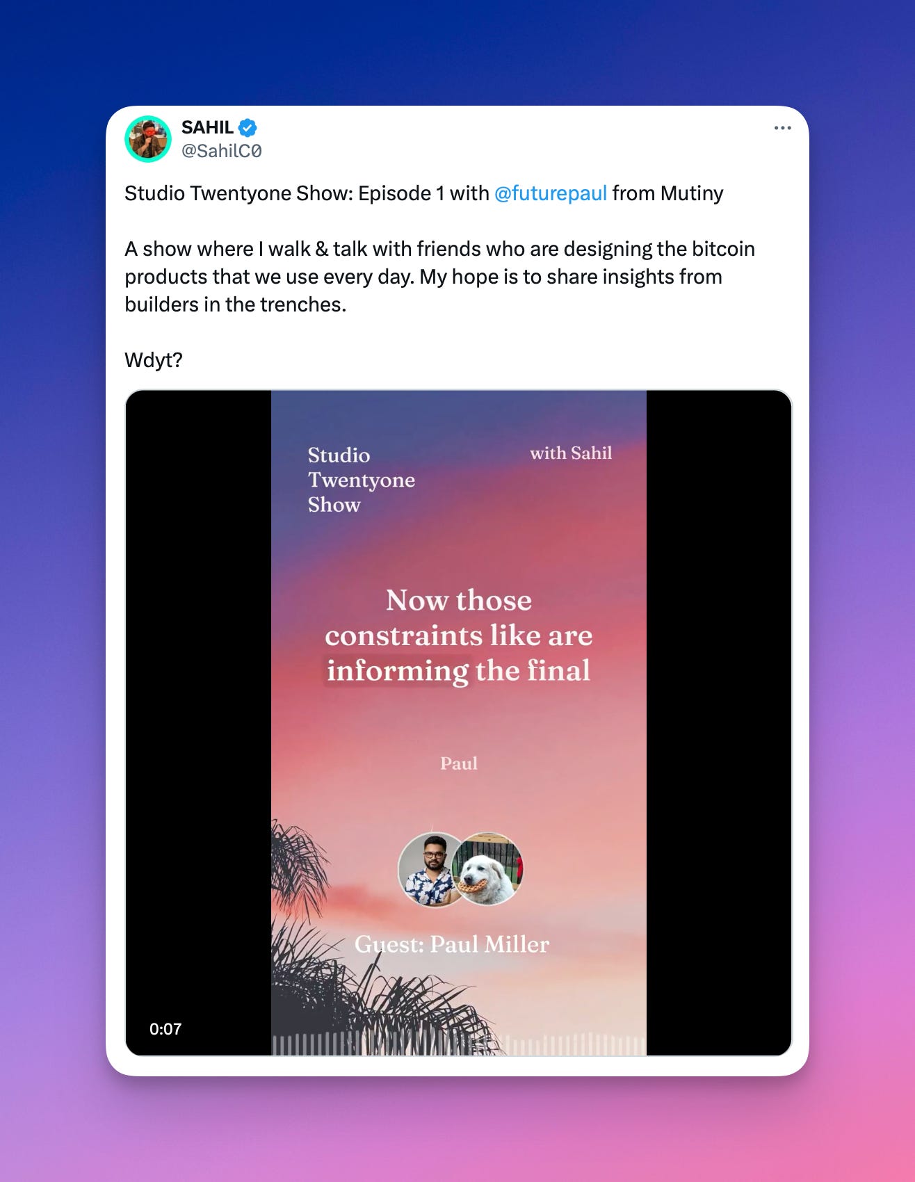 So I’m starting a new experiment: the Studio Twentyone Show, where I walk & talk with the designers actually shipping the bitcoin products we all use every day. No studios, no fluff, all design talk. I’m hoping there’ll be some useful insights for you!